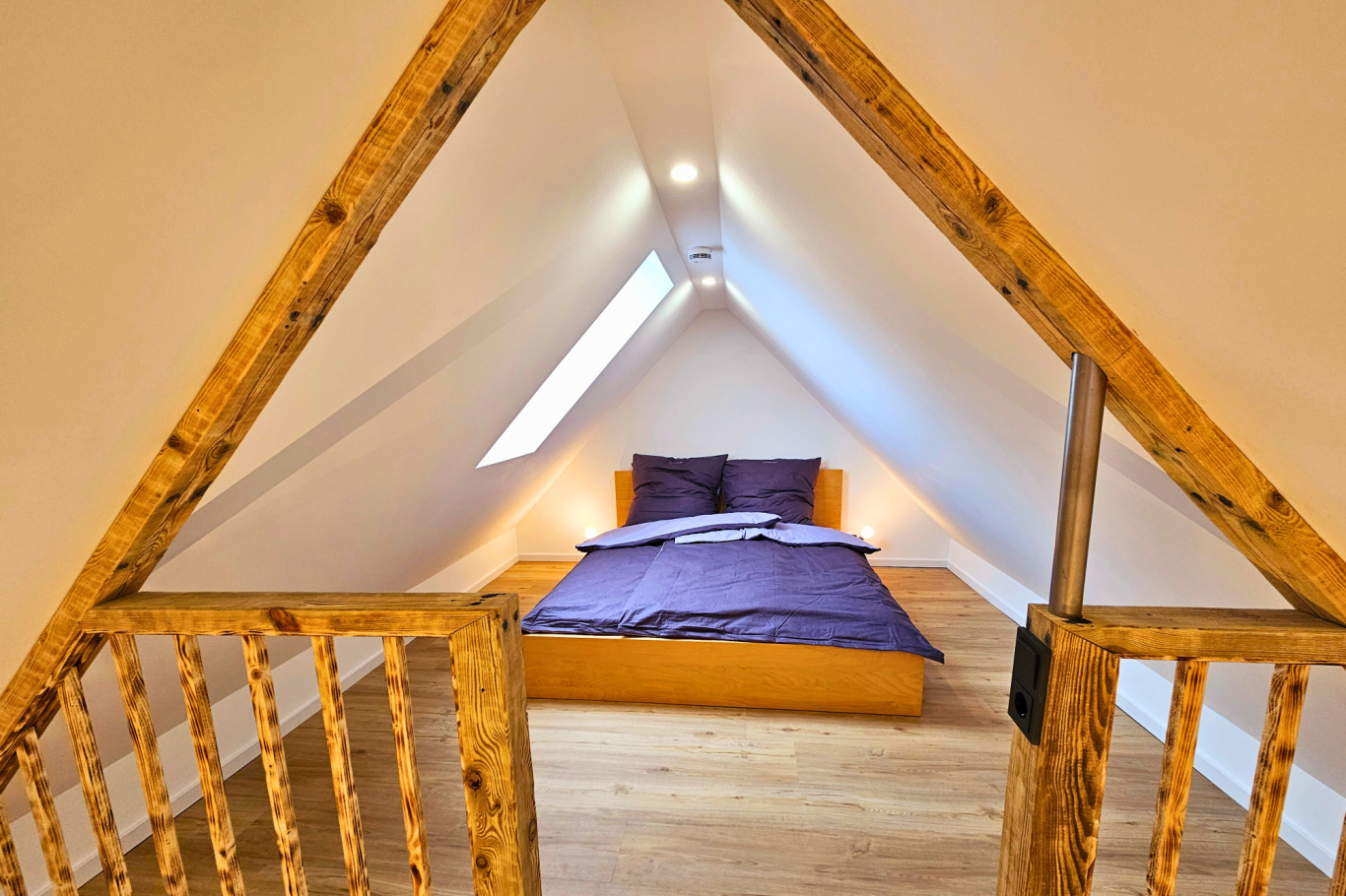 Doppelbett (160x200 cm) auf einer Schlafempore, welches über eine Leiter vom Wohnzimmer aus erreichbar ist.