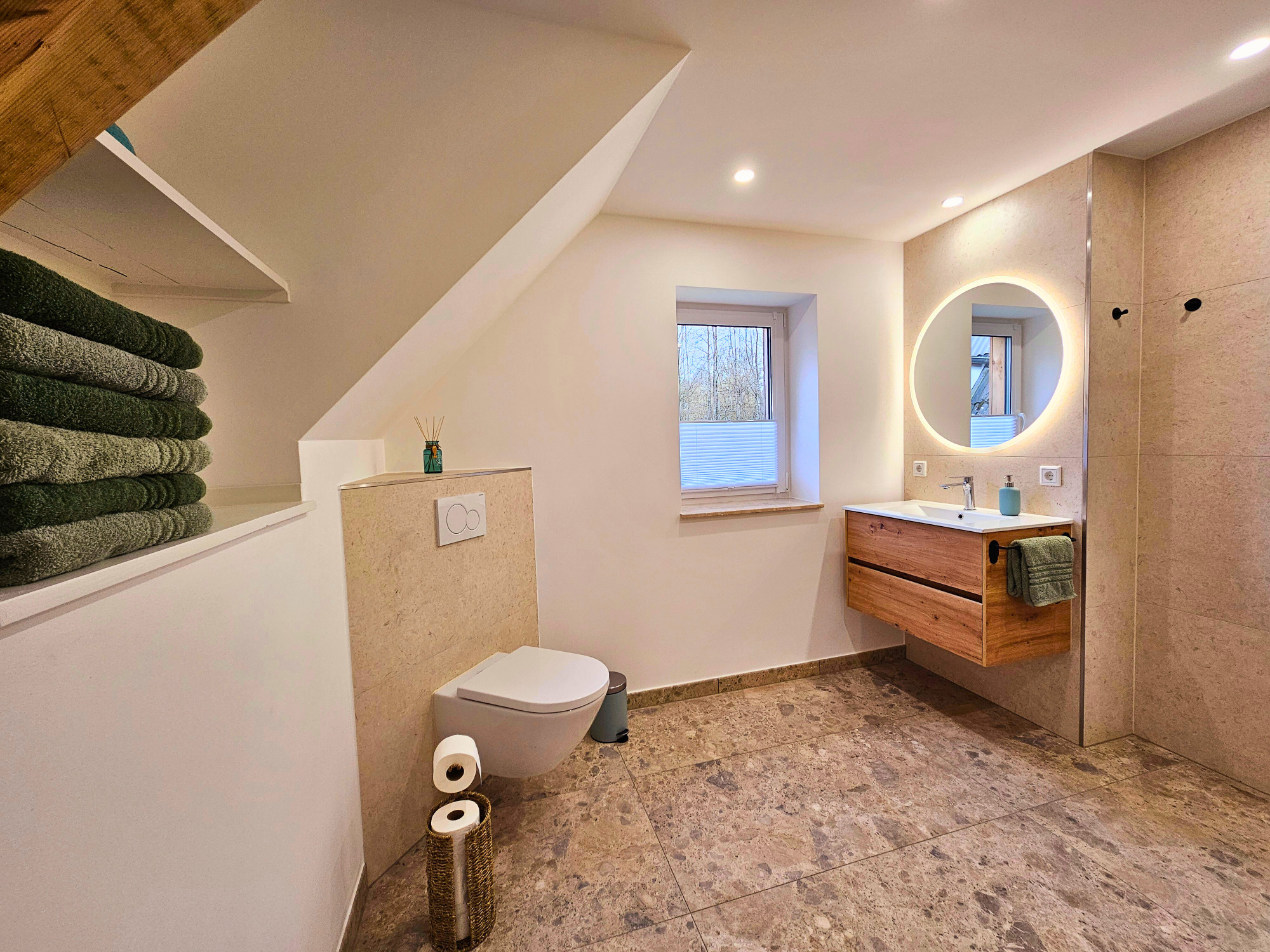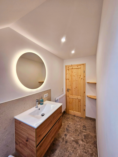 Auf dem Hofplatz stehen ausreichend Parkplätze zur Verfügung. Der Haupteingang zur Wohnung liegt direkt neben der Garage. Hier ist auch ein Schlüsselkasten für die Eingangstür. Ein kleiner Flur mit Treppe führt direkt in die Wohnung.