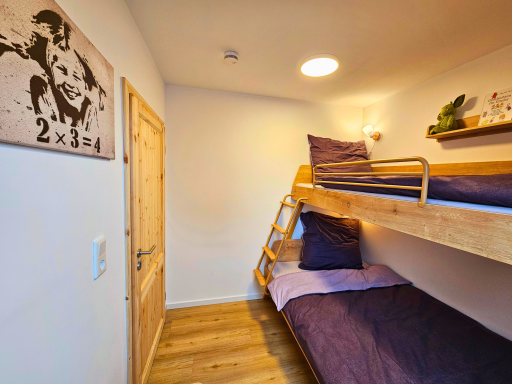 Vom Eingangsbereich über eine kleine Treppe hoch erwartet dich eine offene moderne und große Küche. Angrenzend befindet sich das große Ess- und Wohnzimmer mit einem großen Sofa. Drei Schlafzimmer, zwei mit großem Doppelbett und TV. Die linke Matratze ist medium und die rechte Matratze hart. Oben drauf ist ein Topper für die erholsamen Nächte. Das Einzelzimmer hat ein Etagenbett. Das untere Bett ist 120x200 cm und das obere 90x200 cm.