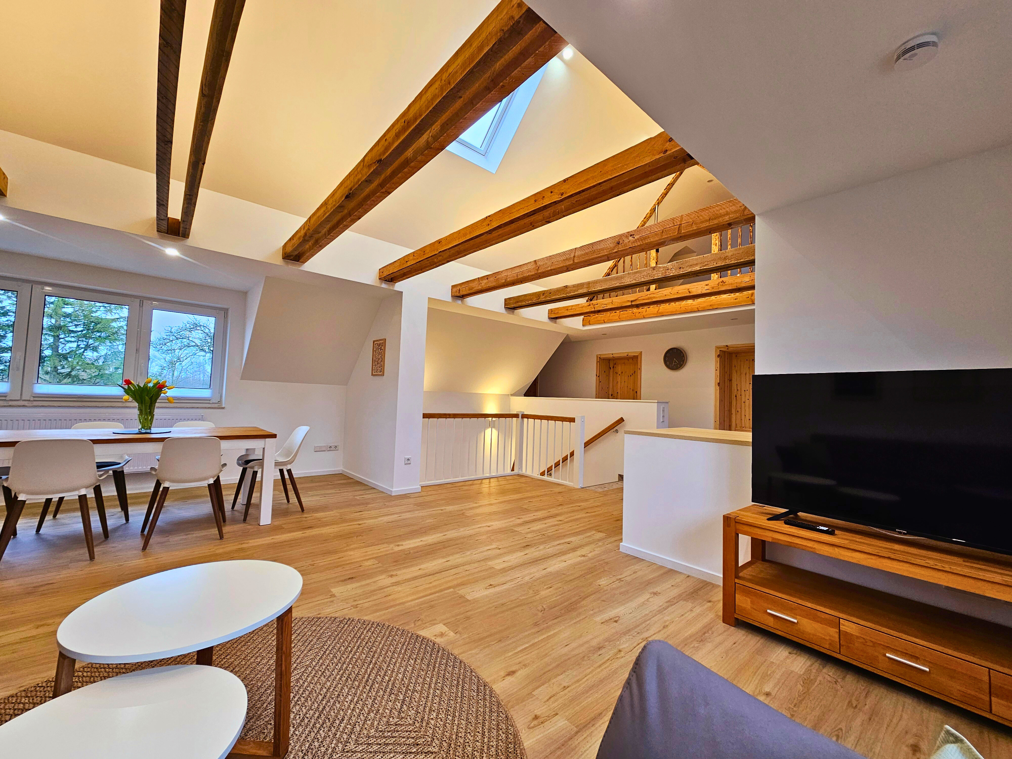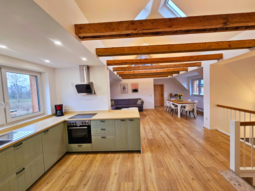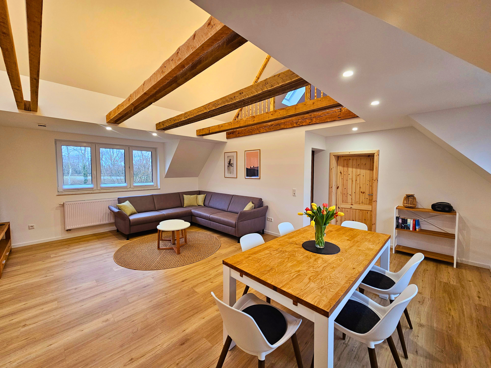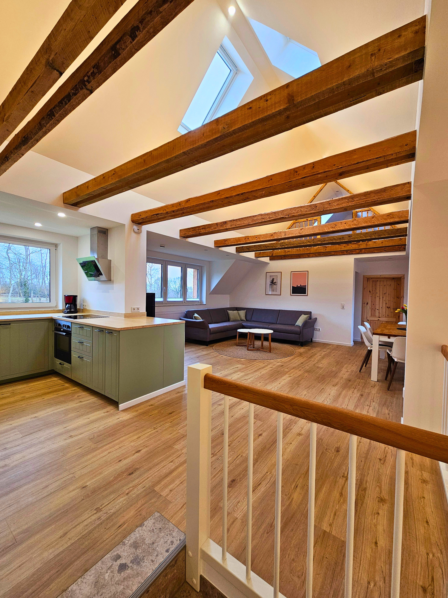 Ein offenes Wohnkonzept und viel Platz. Modern mit offener Decke und alten Scheunenbalken. Rundherum Wiese und Felder und dennoch schnell in Flensburg und an der Ostsee. Zwei Schlafzimmer mit Doppelbett und ein Schlafzimmer mit Etagenbett. Auf der offenen Empore im Wohnzimmer befindet sich ein weiteres Doppelbett. Eine Schlafcouch steht auch zur Verfügung.