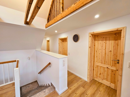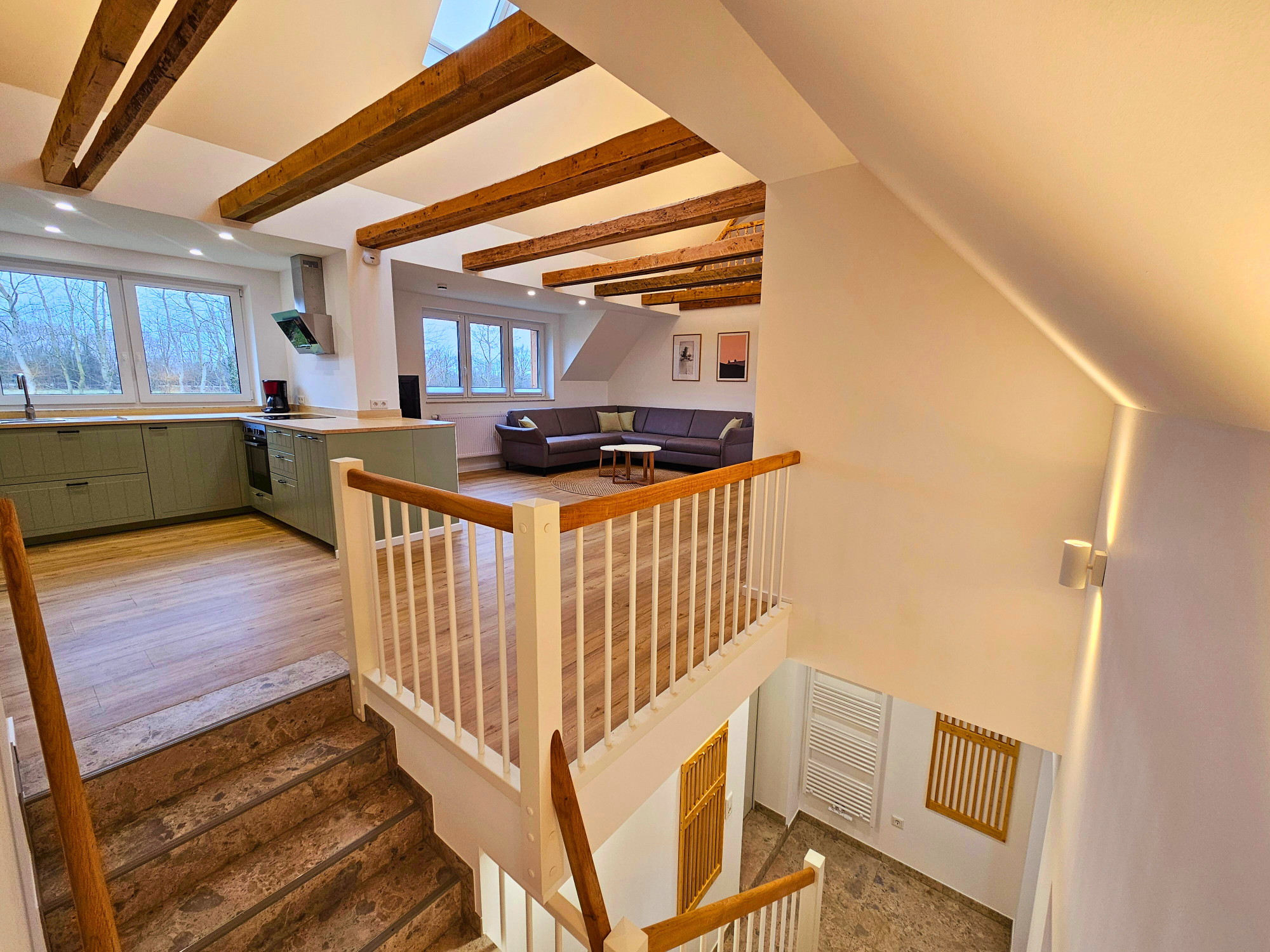 Schon im Eingangsbereich kann man die offenen Scheunenbalken sehen und sogar bis in den Dachgiebel blicken. Modern, hell, offen sowie ein rustikaler Landhauscharme sorgen für ein außergewöhnliches Raumgefühl.