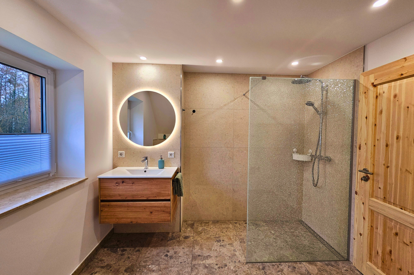 Großzügiges Badezimmer mit ebenerdiger Dusche, WC und Waschbecken.